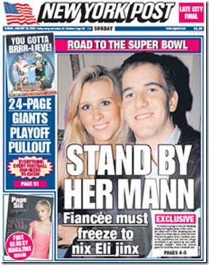 Abby McGrew is the fiancee of New York Giants' quarterback Eli Manning. Sure she is a steadfast fan of Manning. But there were those times that Manning lost the game when McGrew has watched her man playing from a suite. So in order not to let those anguish time re-happen, Abby McGrew will stand in the chilling weather rather than in the warm stadium suite to watch Manning's game against the Green Bay Packers to reach Super Bowl XLII in Phoenix. Apparently, Eli Manning is more clever than Tony Bono, whose girlfriend Jessica Simpson was jinxed by the fans. All the best for McGrew and Manning! Souce: FOX Sport