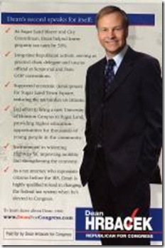 Dean Hrbacek, a tax lawyer and accountant, is the former mayor of Sugar Land, Texas. He is now one of ten Republican candidates to seek the party's nomination to run against Democratic U.S. Rep. Nick Lampson. But this U.S. House candidate had something so surprised that stunned a lot. A mailer from his campaign contains a photo (above) of Hrbacek's head attached to an image of a different body that makes him look thinner. Apparently, the fake picture is a computerized composite of Hrbacek's face and someone else's slimmer figure. Hmmmm......now I know the slimmer body physique is also vital to the politics! Source: Houston Chronicle