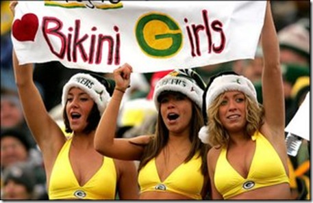 Braving the temperature of one below zero at Lambeau Field, these three Green Bay bikini girls still couldn't bring the good luck to the Packers which was defeated 23-20 by the New York Giants.