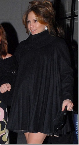Though dressing in a billowing frock coat, the heavily pregnant singer-actress still couldn't hide the enormous bump grows increasingly noticeable - which has caused months of speculation that J-Lo is pregnant with twins. Link; Picture via