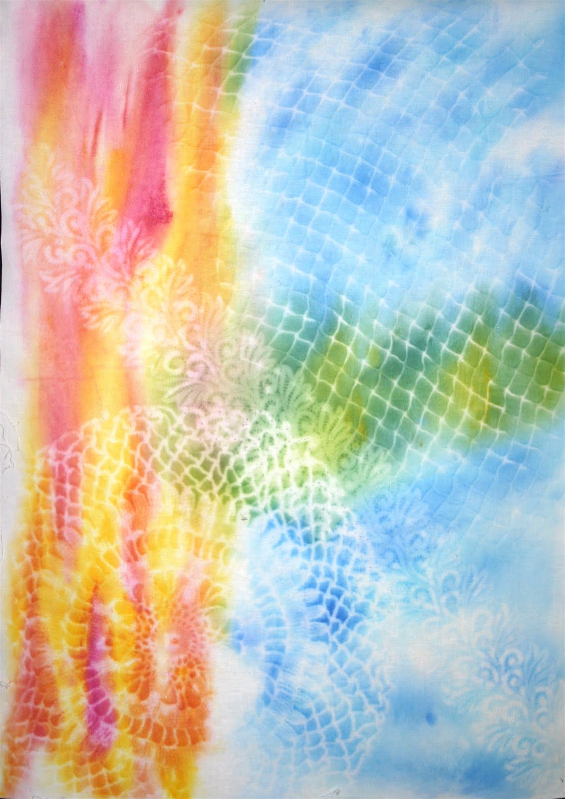 I used tree branches as a resist and spray painted w/Tulip Fabric Paint